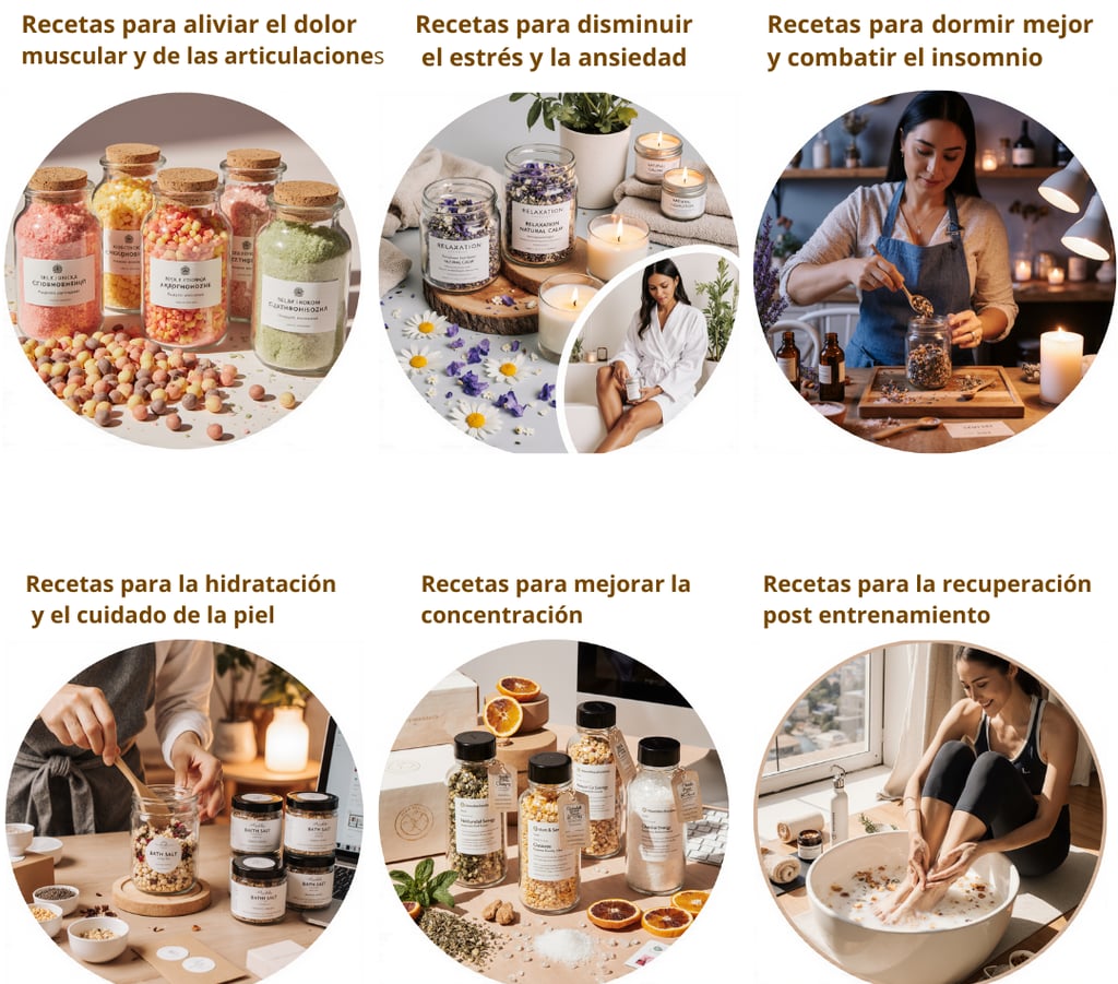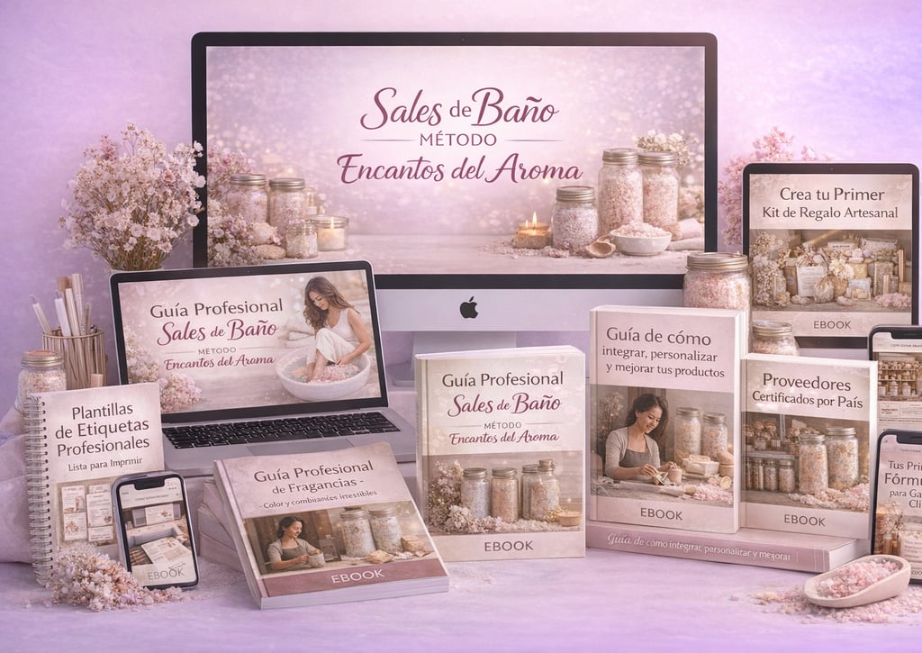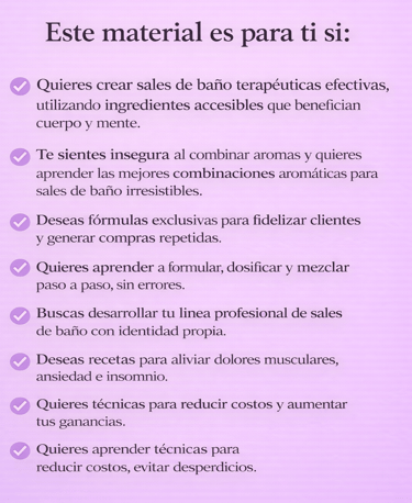 Es un material exclusivo que te lleva a través del universo de las sales de baño artesanales, con contenidos visuales, ilustraciones atractivas y explicaciones claras, diseñadas para ayudarte a aprender, crear y aplicar cada receta como nunca antes, ya sea para uso personal o para generar ingresos desde casa.