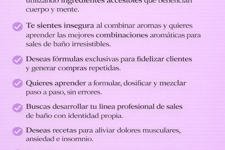 Aprende a formular Mezclas Funcionales con Beneficios Reales, optimiza tus costos de producción y transforma cada sal de baño en un producto natural irresistible que tus clientes querrán comprar una y otra vez.